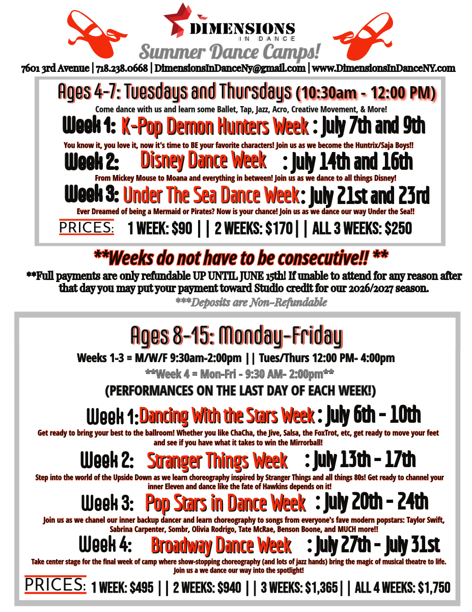 * Please look carefully and note the different age groups and different time schedules. As always, feel free to email DimensionsInDanceNy@gmail.com with any questions! *